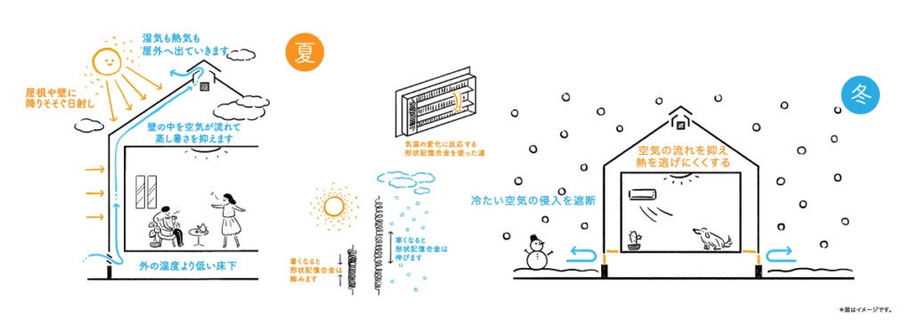 気温の変化を感知してバネが伸縮し、換気口の扉を自動で開閉させます。電気を使わずに家の「衣替え」を自動で行うための熱感知センサー兼アクチュエーター(駆動装置)として活用されています。