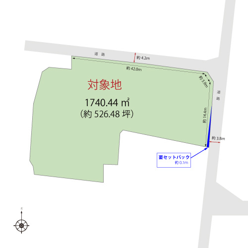| 接道状況 | 北側公道幅員約4.2mに約48m接道 東側公道幅員約3.8mに約14.4m接道 |
