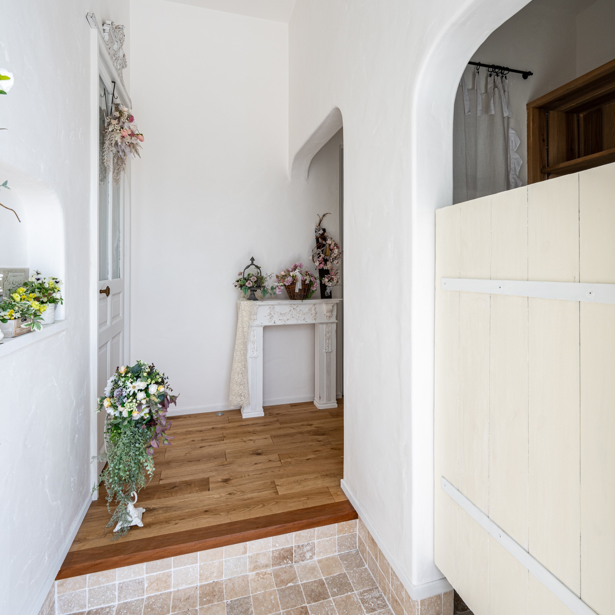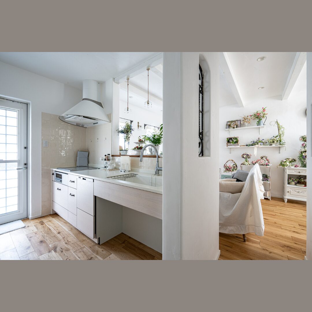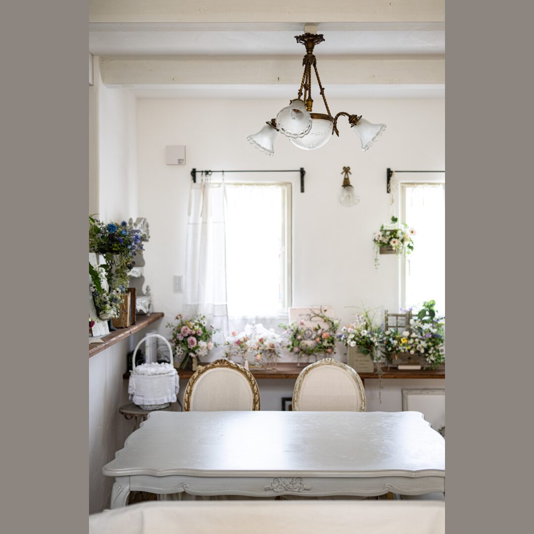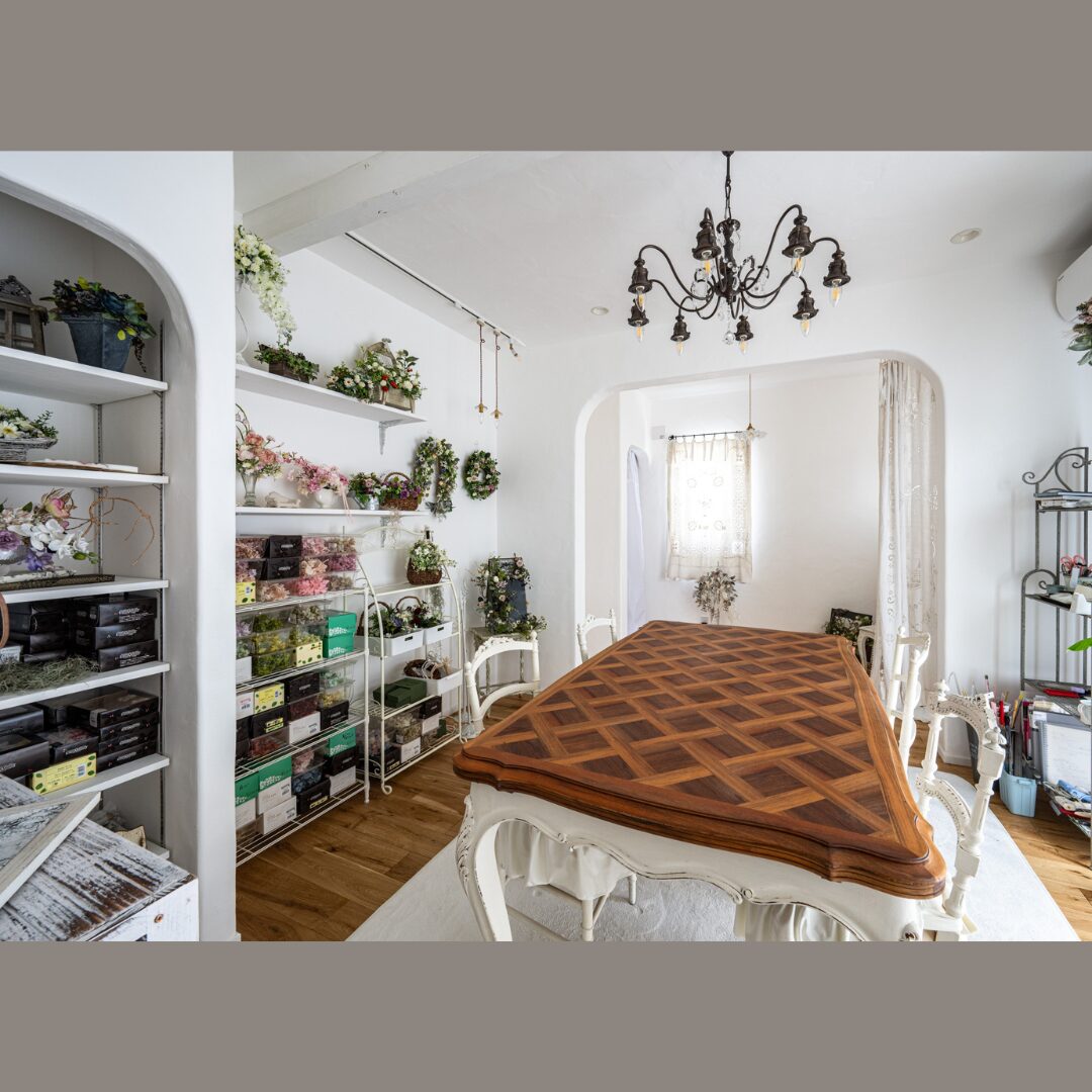 お施主様の趣味のお教室アーティフィシャルフラワーがより引き立つ素敵な空間に魅了されます。